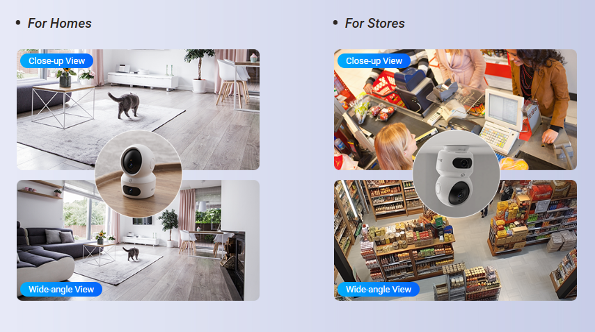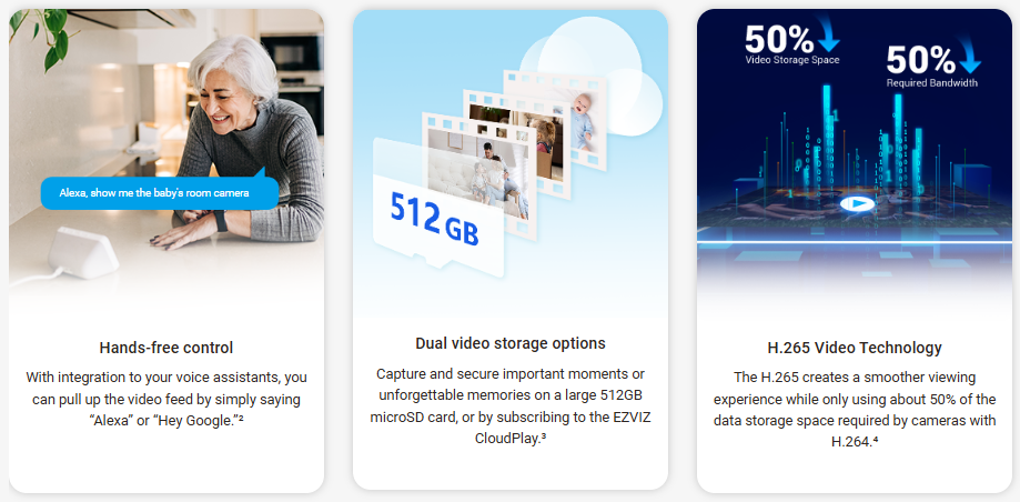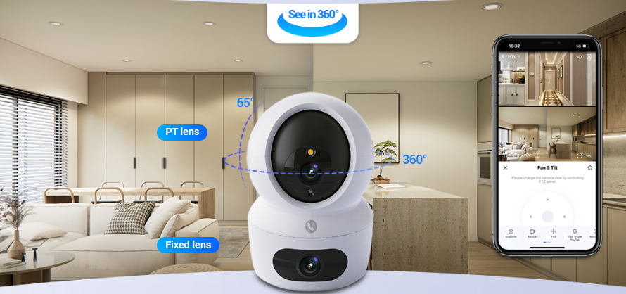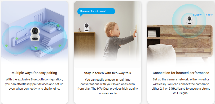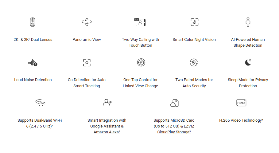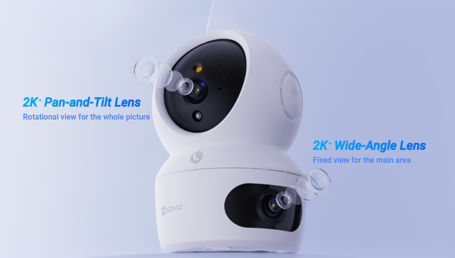 The EZVIZ H7C Dual-Lens Camera delivers 2K+ video quality through dual 4MP lenses, providing enhanced indoor surveillance coverage. It features pan and tilt movement, color night vision, and smart human detection for accurate alerts. The camera supports two-way audio communication, connects via Wi-Fi, and allows local storage through a microSD card up to 512GB, making it ideal for home and office security.