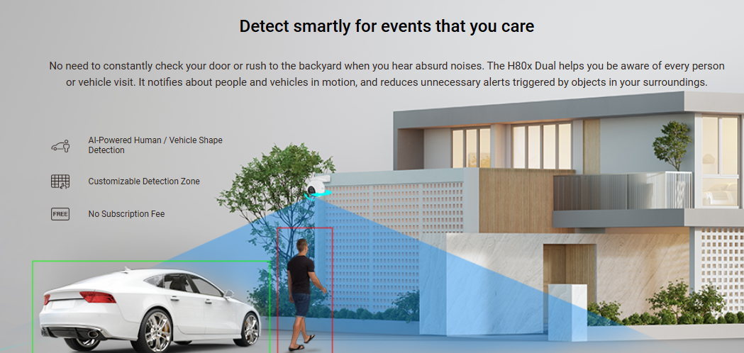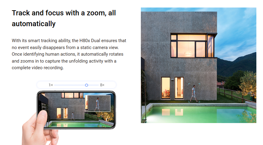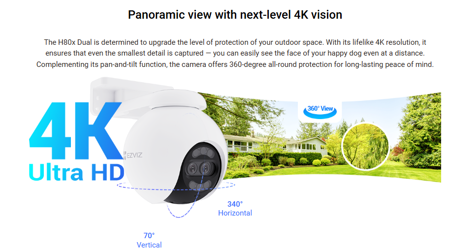 The EZVIZ H80X is a high-performance outdoor security camera featuring a dual-lens setup with 8MP resolution for enhanced wide-angle and zoom monitoring. It supports AI-based human and vehicle detection, full-color night vision using advanced Colorful technology, and smooth pan-tilt movement with auto-tracking. Built for outdoor environments, the camera delivers reliable performance in varying weather conditions and uses H.265 video compression for efficient storage. Users can record footage locally via microSD cards up to 512GB or securely store videos on EZVIZ CloudPlay, with convenient remote access through the EZVIZ mobile app.