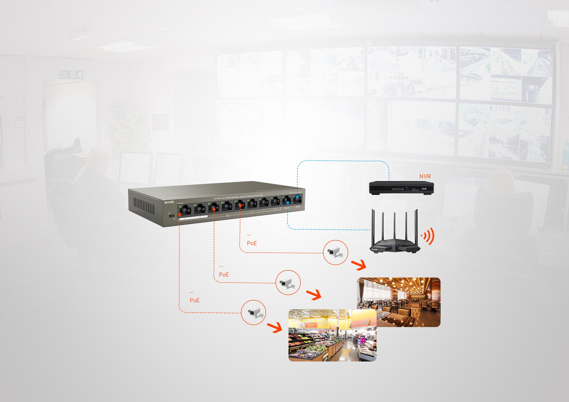 8 × 10/100 Mbps PoE ports and 2 × uplink ports