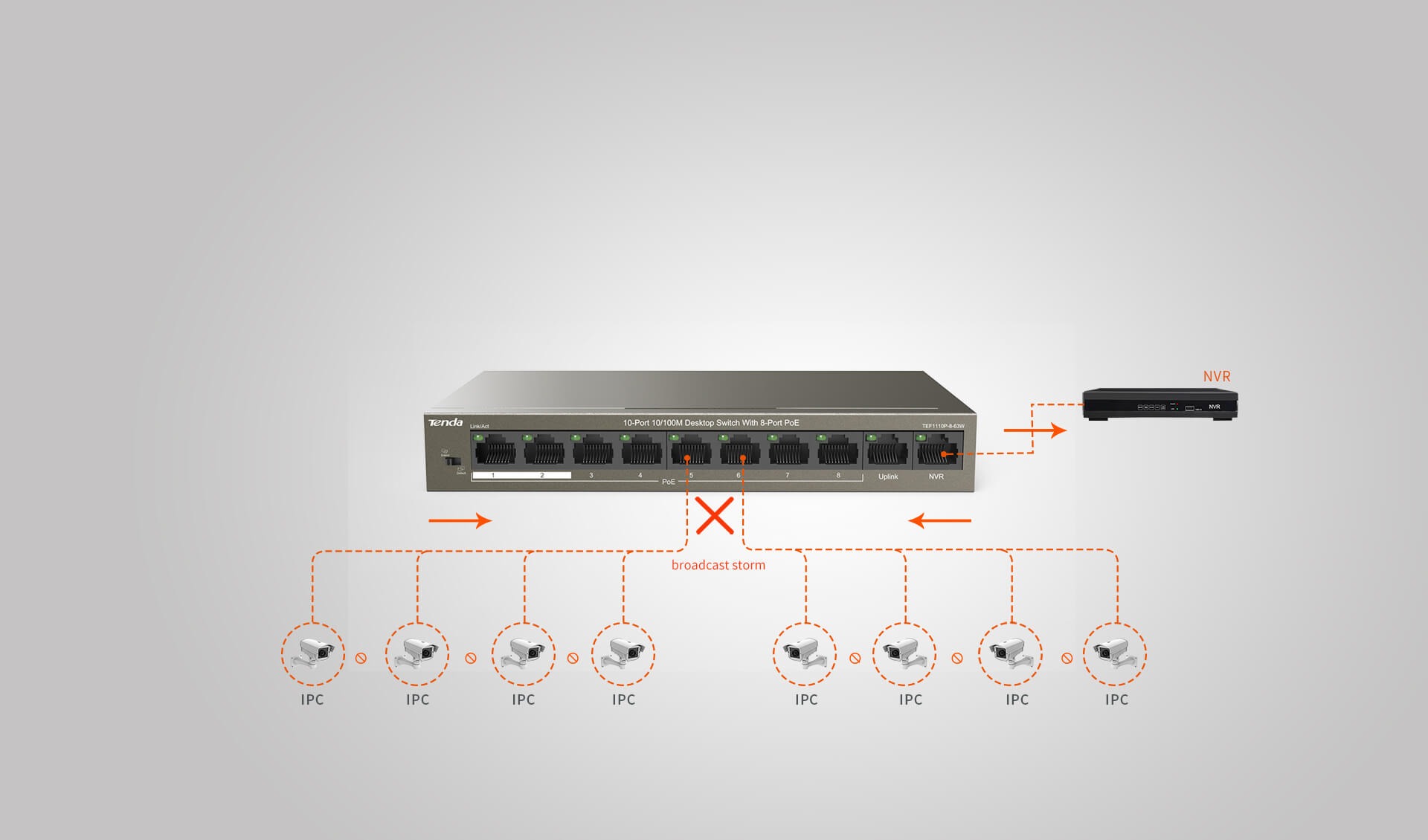 8 × 10/100 Mbps PoE ports (data + power), and 2 × 10/100 Mbps uplink ports